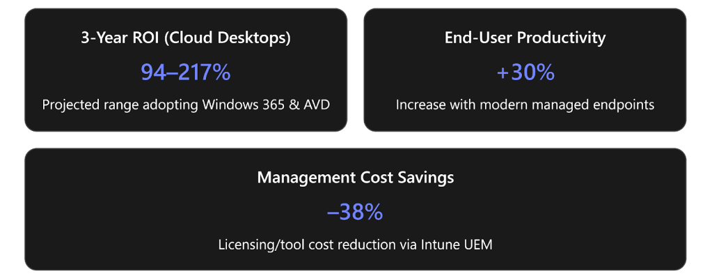 | Windows 365 Cloud PC | Personal Cloud PCs: full Windows desktops accessible anywhere, on any device Simplified IT: quick provisioning, no on-prem infrastructure needed for VDI Security by design: data stays in cloud, not on local devices Hardware savings: extend PC refresh cycles, enable BYOD with low risk | 94–217% 3-year ROI (combined Cloud PC/AVD adoption) Up to $1.2M savings on device costs over 3 years for ~2k users (via BYOPC). Users save ~10 min/day from reduced downtime (adds thousands of hours of productivity annually). |