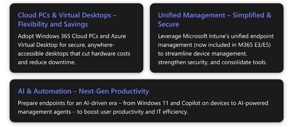 In essence, staying ahead with endpoint innovation is an investment in agility. Large enterprises are moving fast on AI and cloud-managed everything, but SMEs actually have an advantage: you can often adopt new tech faster due to less legacy process holding you back. By investing in modern endpoints (cloud PCs, unified management, Windows 11, AI capabilities) in 2026, you position your business to punch above its weight. You’ll enable your people to be as productive as those in much larger organizations, and your IT to be as effective and secure, if not more.