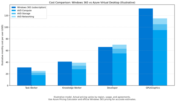 Cost Comparison: Windows 365 vs Azure Virtual Desktop (Illustrative)